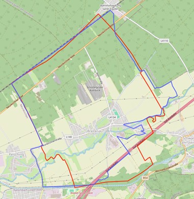 Der Breitenauer Grenzwanderweg (BGWW) führt so nah wie möglich entlang der Grenze rund um das Breitenauer Gemeindegebiet. Die Wegführung beschränkt sich auf öffentlich zugängliche Wege bzw. Straßen. Hier die Streckenführung (blau) und die Gemeindegrenze (rot):